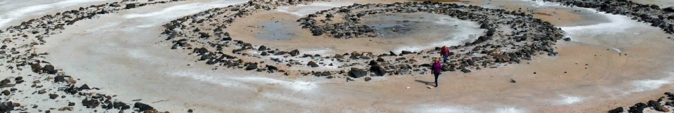 Aerial Panning Shot Mother Daughter Dog Hiking Through Spiral Jetty