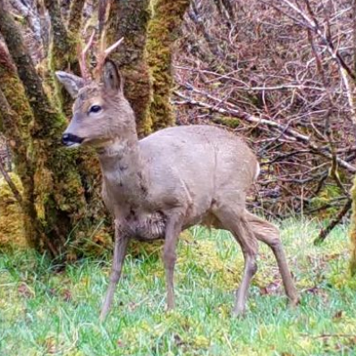Roe Deer Buck Walking Across Grass Among Trees, Daytime, Isle Of Skye Wildlife