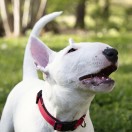 Miniature Bull Terrier Sitting Outside On A Pile Of Wood In The Forest