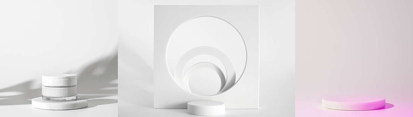 Minimalistic Concrete Podiums Group On Gray Background. Mock Up For Product..