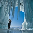 Vertical Video Of Lake Baikal In Winter. Amazing Texture With Bizarre Icicles