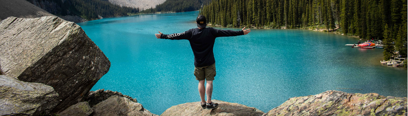 Moraine Lake At Sunrise, With Tall Jagged Mountains And Forests, Alberta, Canada