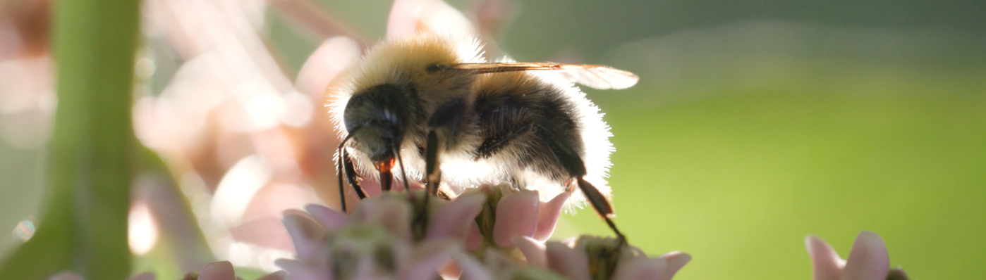 Bee Pollinating A Light Pink Flower Backlit By The Sun