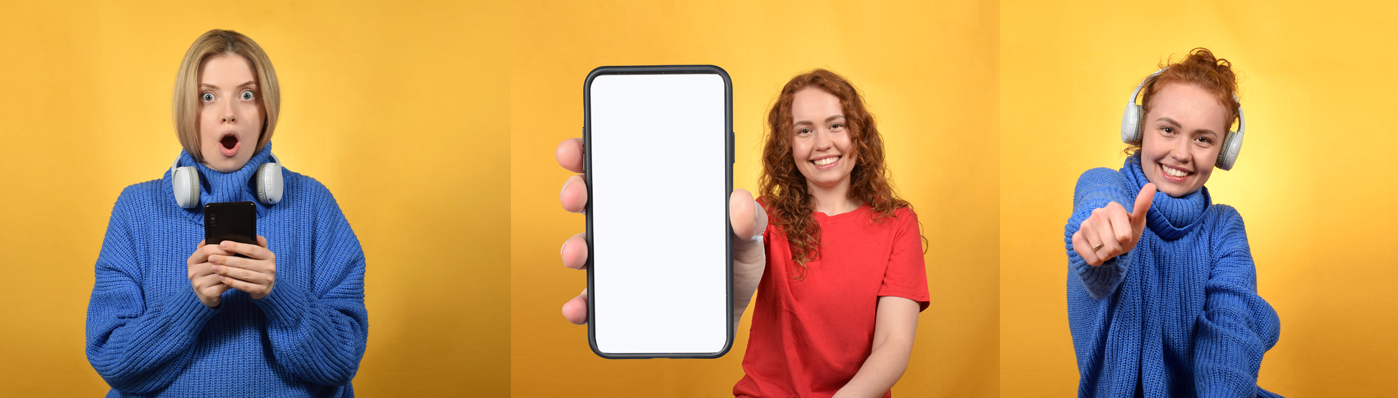 Young Pretty Woman Shows Smartphone With Blank White Screen, Win
