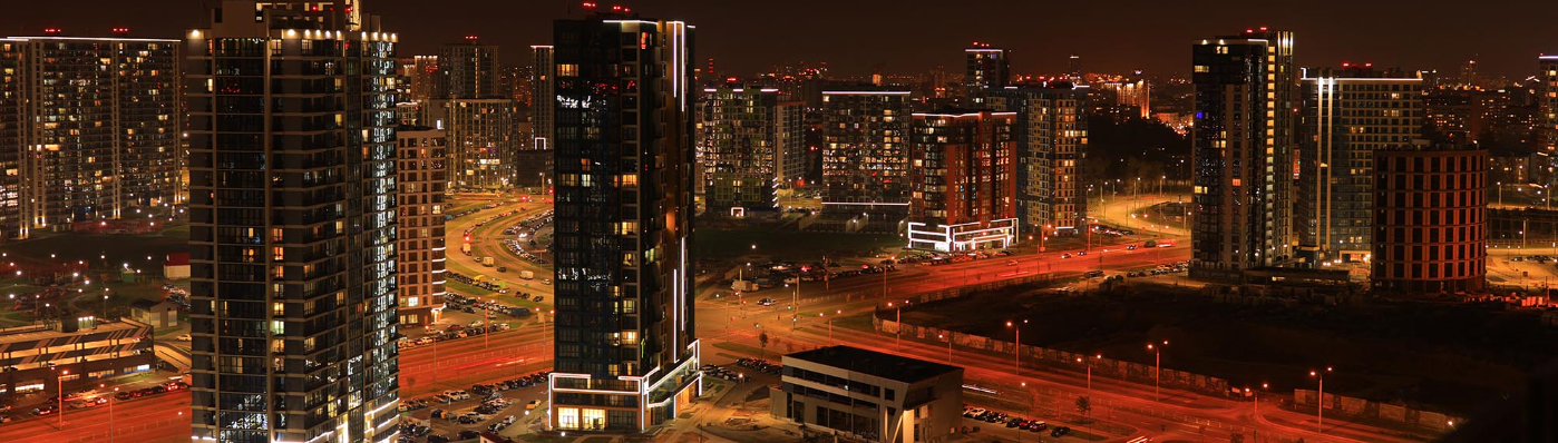 City View, Modern Buildings And Skyscrapers Against The Blue Sky.