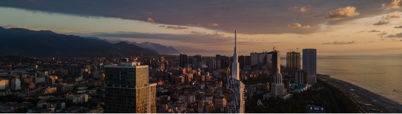 Drone Descends Over Beachfront Houses Of Batumi (Sunset)