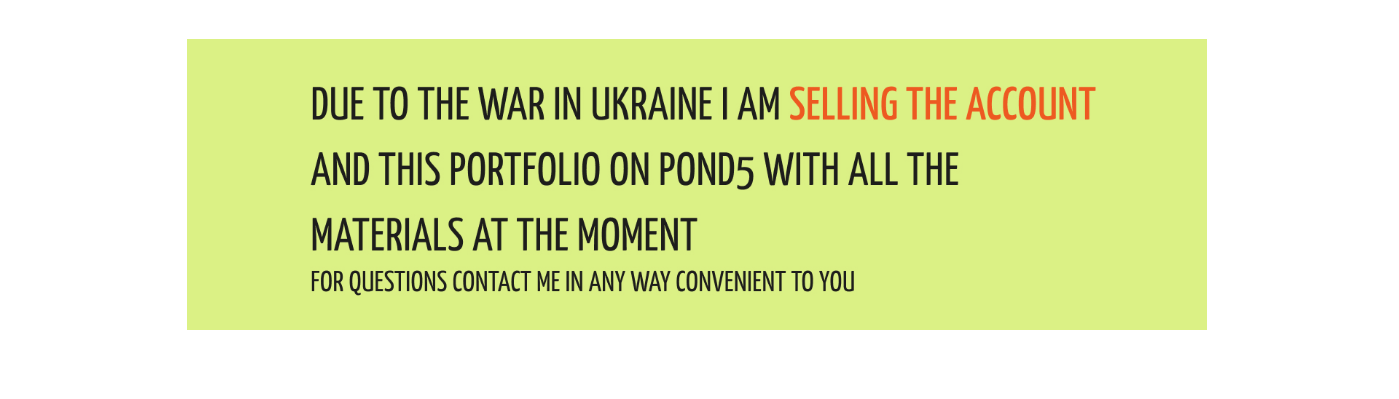 Hello! For nowadays I am selling the account and this portfolio on POND5 with all the materials at the moment. For any questions contact me in a way convenient to you. ALSO I'M SELLING MY PORTFOLIOs AT: https://www.istockphoto.com/uk/portfolio/TakeFive https://depositphotos.com/ua/portfolio-13170244.html?content=video&sorting=best_match