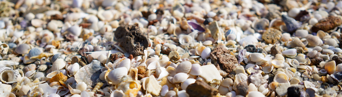 High Angle Close Up View Of Two White And Tan Seashells On Coarse Wet Sand