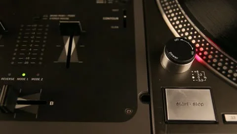 Listening the Music. Dj equipment. Turntables, Needels, Records and mixers. 1920x1080. Full Hd