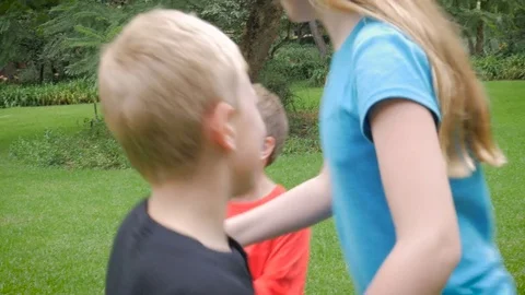 Two young brothers and their older sister play together outside in a park with their parents.