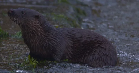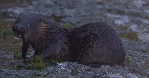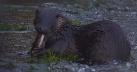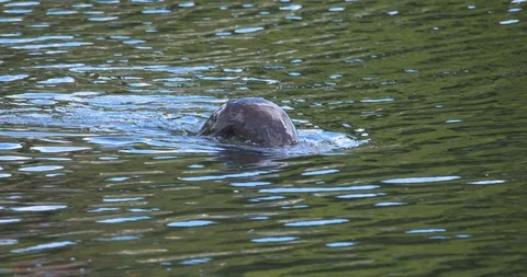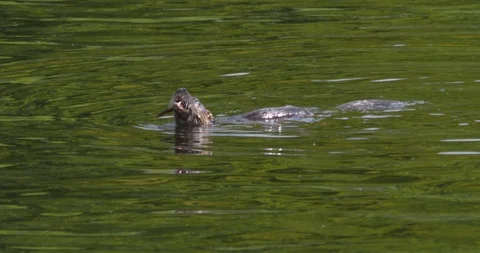 Otter (Lutra lutra) diving and swimming in River Lee, Cork City, Ireland. 4K, 2K slow motion nature footage of river otters catching and eating fish and eels. 150fps Sony XAVC
