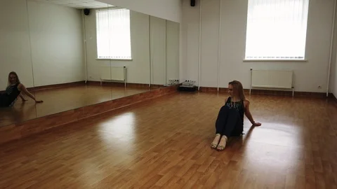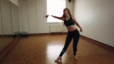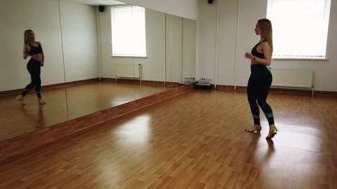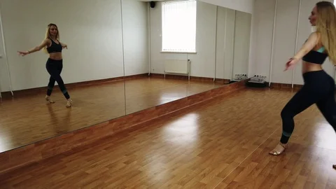 Young simpotichnaya girl practicing dancing in a small room with a mirror