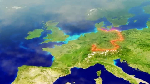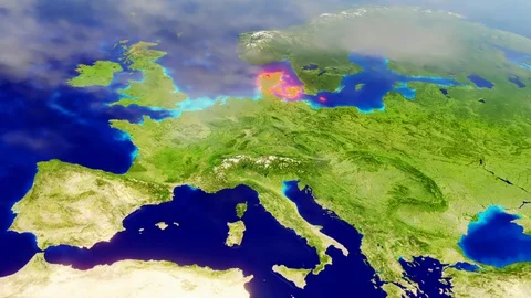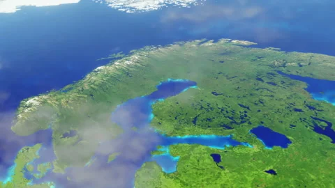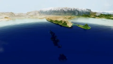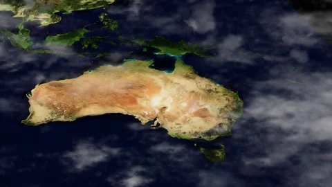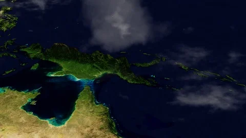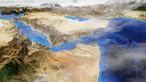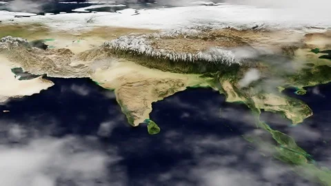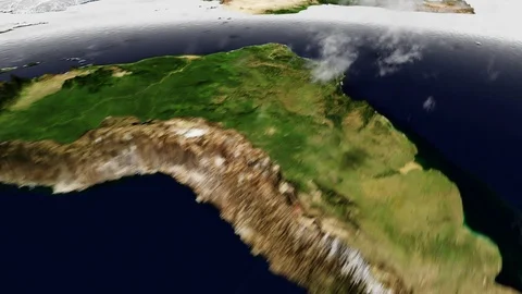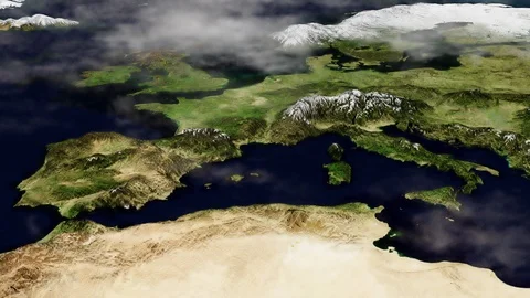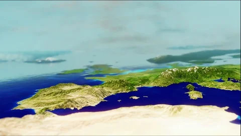World maps rendered in 3D CGI with clouds and high relief for mountains