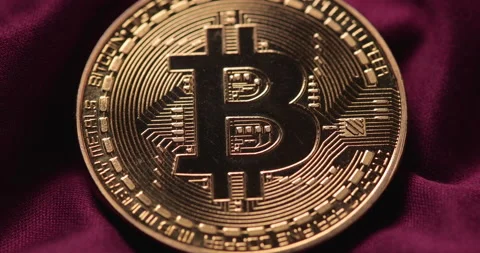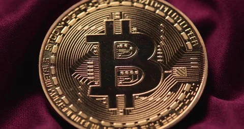 (4)A single physical bitcoin sits upon luxury maroon silk material. Various panning and tracking motion controlled shots.