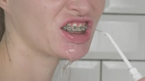 Using dental irrigator, cleans braces