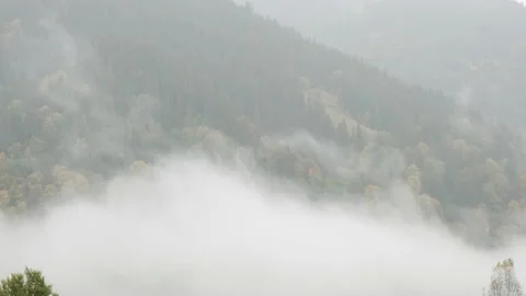 (20)Rain and fog in the mountains. The clouds move up the slope of the green mountain covered with spruce forest. Fog covered mountain forest. Autumn foggy weather in mountain