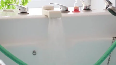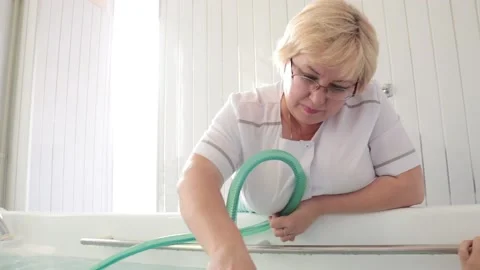 (24)A young girl in a swimsuit slowly sits in a bath with mineral water. Nurse hand checks the temperature of the water. Bright room. Аverage plan