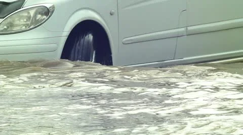 (72)Footage of rain: in city streets, on car window, heavy stormy rain, storm from car window, flooded streets, cars moving along flooded streets, people walking in flood, water falling from roof.