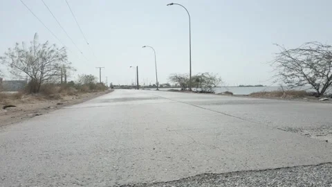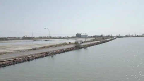 (17)Drone shot of the Atlantic Ocean of the coast of The Gambia. Cloudy sunset.