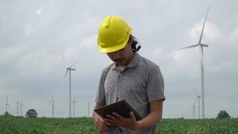 Asian male Wind Turbine engineer work at a Wind Farm. A large wind turbine field in the northeastern region of Nakhon Ratchasima. Slow-motion