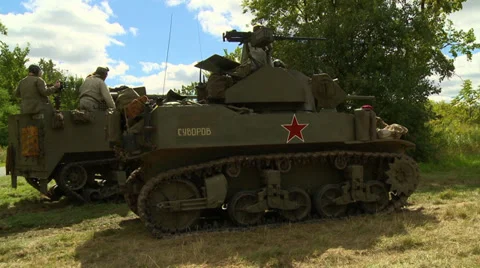 Recreated battle and daily life scenes of World War II with American, German and Russian forces and their vehicles.