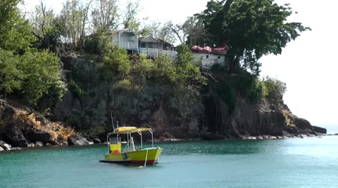 (53)A French island in the Caribbean. It is European also. Stones and sand are dominated by volcanic rocks. We make a trip to the part of the island, which is called "Basse Terre". There are small simple villages along the coast. Because of the volcanoes on the west side of the island the rocks are black and the sand on the "Plage de Malendure" is gray.