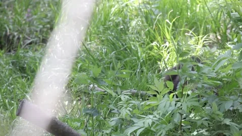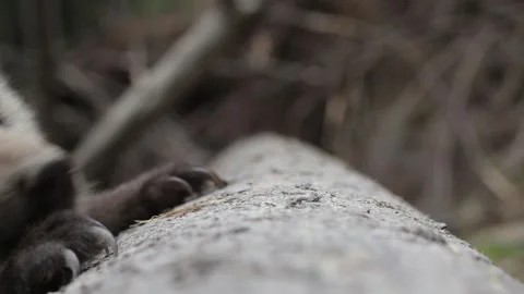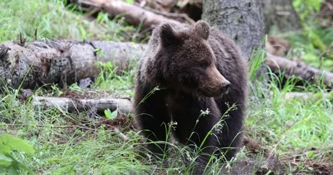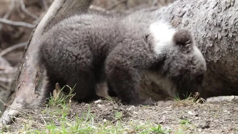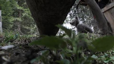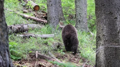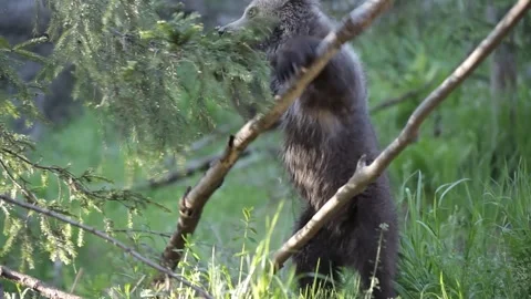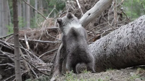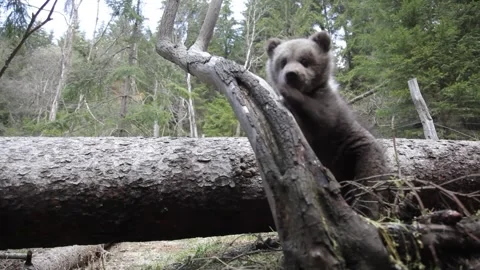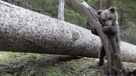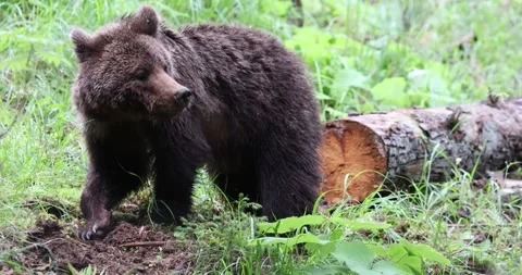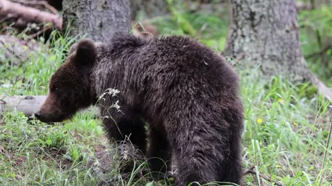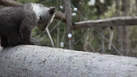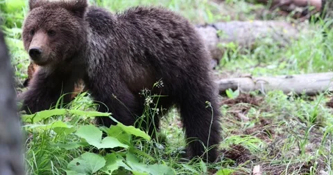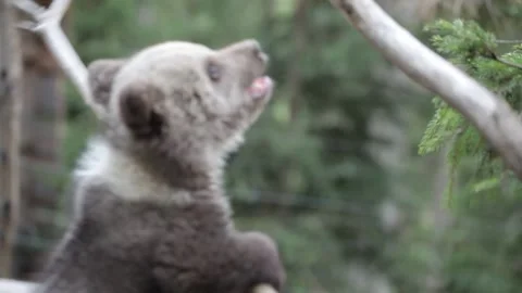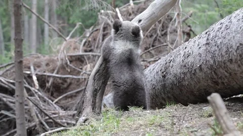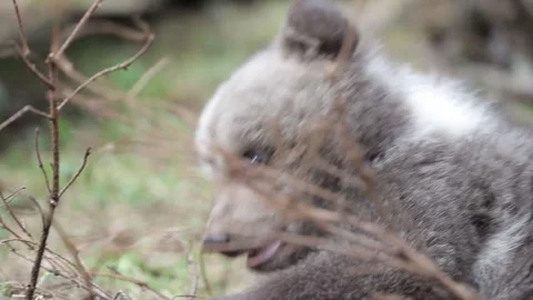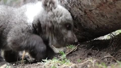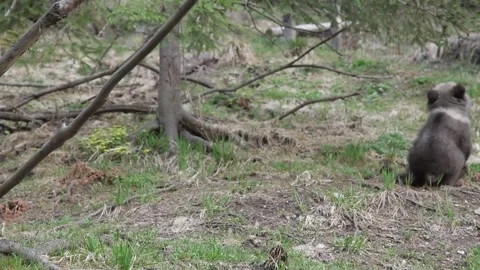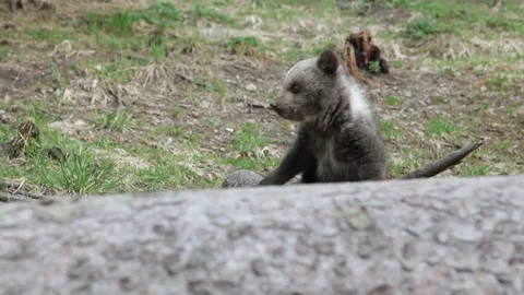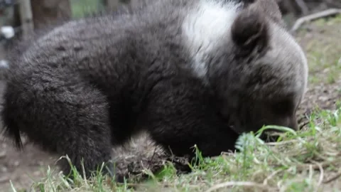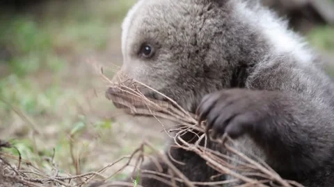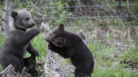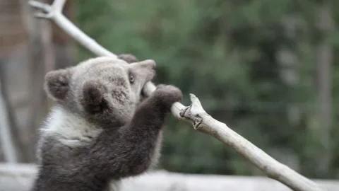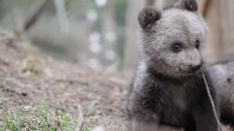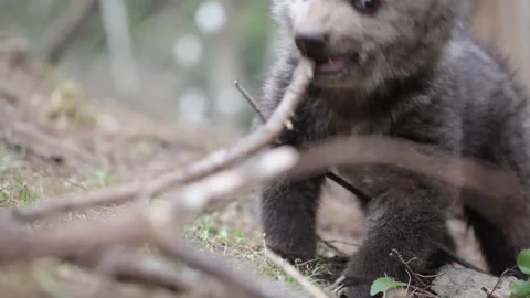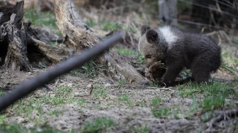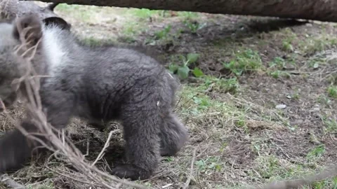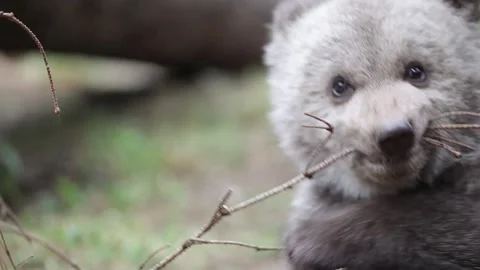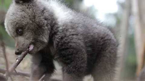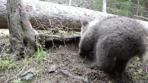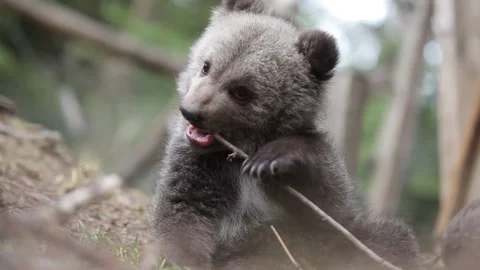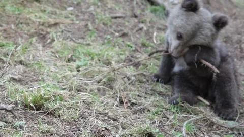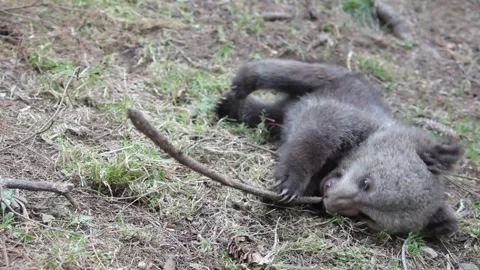 Adorable baby brown bears playing with sticks, digging, running and having fun.