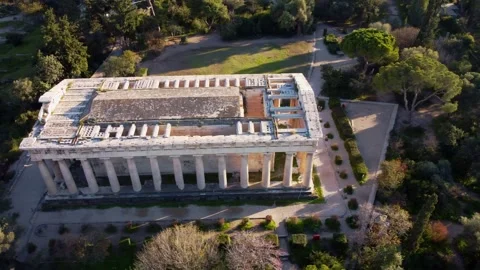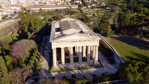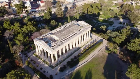 (27)City of Athens, artistic cultural heritage of the ancient Greek civilization. Agora, Temple of Hephaestus, Metropolitan Cathedral of the Annunciation, Acropolis. Architecture, attractions, parks seen from a drone