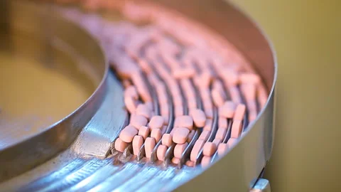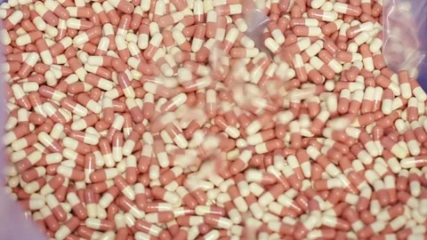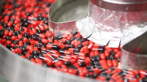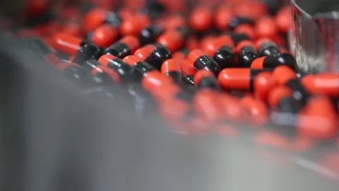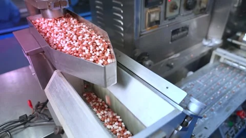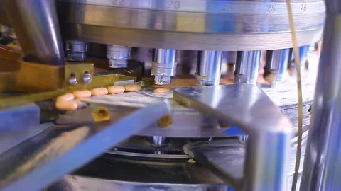 bulk Pharmaceutical tablet, capsules, injection, ampoules, powder, protein powder, syrups, suspension, liquid, gel, cream, ointment, drug making process in a pharma factory. Pharmaceutical manufacturing tablet pill production line. medicine drug tablets capsule on medical equipment. collection pharma making process. liquid filing bottles. chemical liquid sanitiser gel fills in bottles aqueous soap hand wash detergent medicine production line filling making process in plastic transparent bottle manufacturing