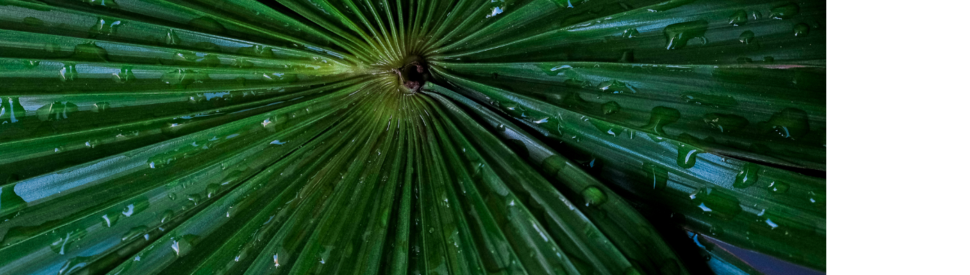 Close-Up Of A Green Palm Leaf Covered With Waterdrops After Raining.