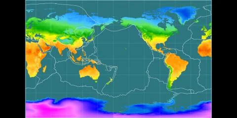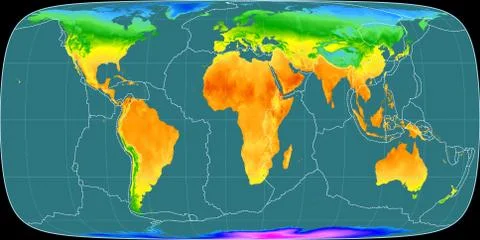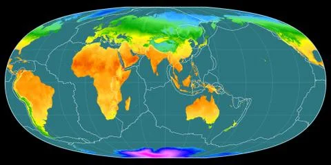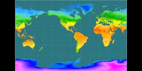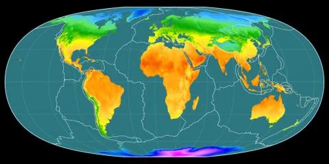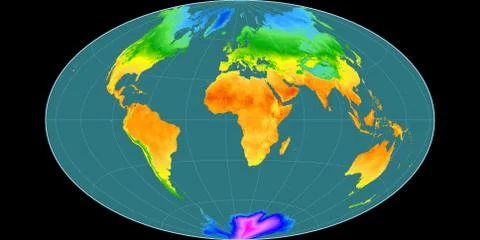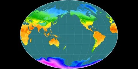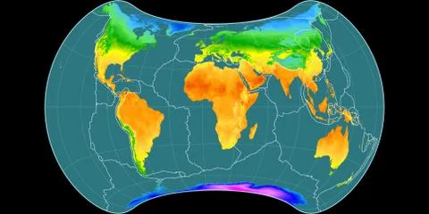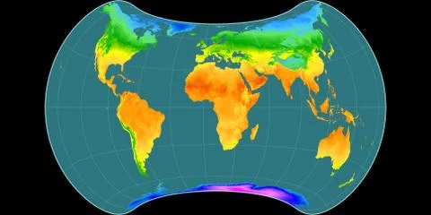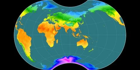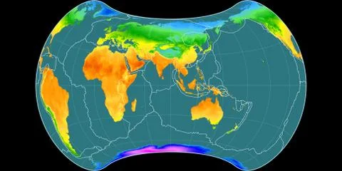 (568)High resolution (15k px) global mean annual temperature and precipitation maps rendered in various cartographic projections, centered on four meridians (11E, 90E, 170W, 90W).
