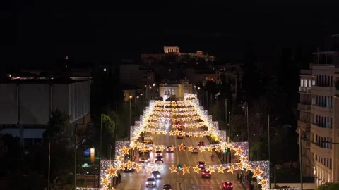 A cinematic aerial view capturing the city at night, glowing with illuminated buildings, vibrant streetlights, and flowing car trails. The drone reveals the energy and beauty of urban life after dark, showcasing patterns of light that create a captivating and atmospheric scene.