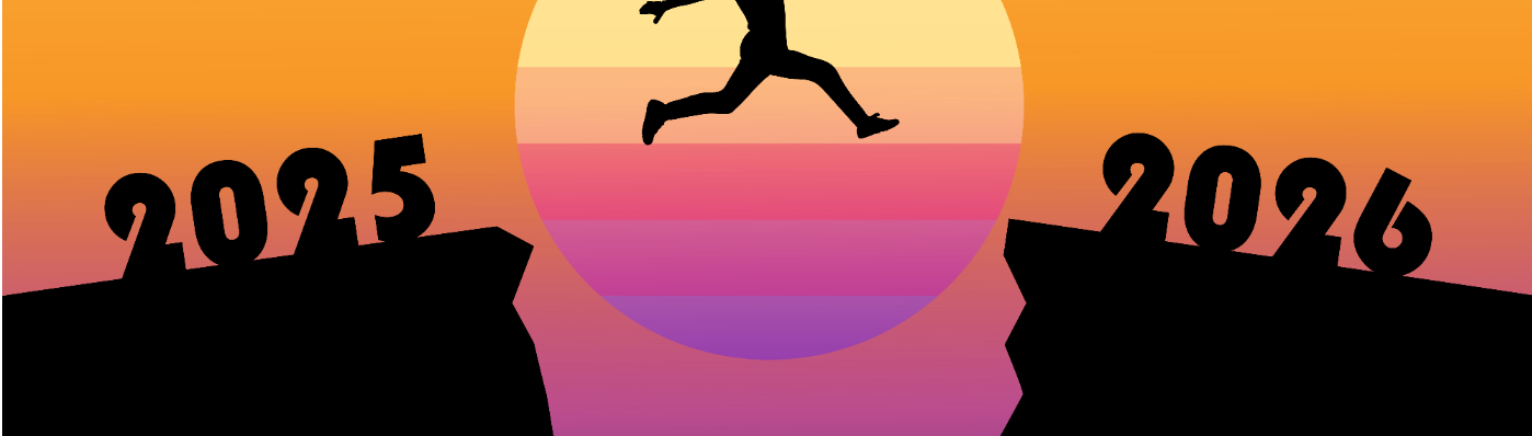 Happy New Year Silhouetted Man Leaps Across A Cliff From 2025 To 2026 At Sunset,