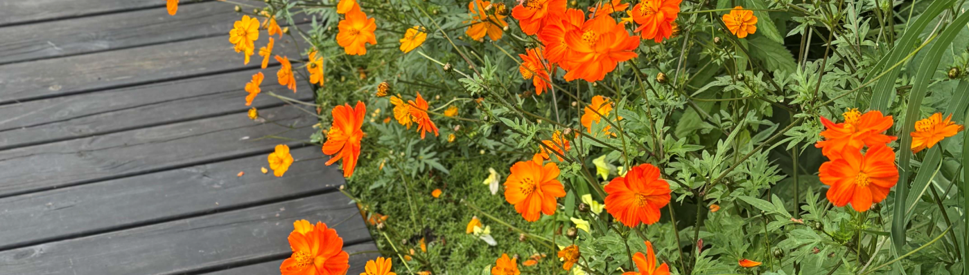 Colorful Garden Flower Bed With Yellow Marigolds In Summer, Lush Greenery