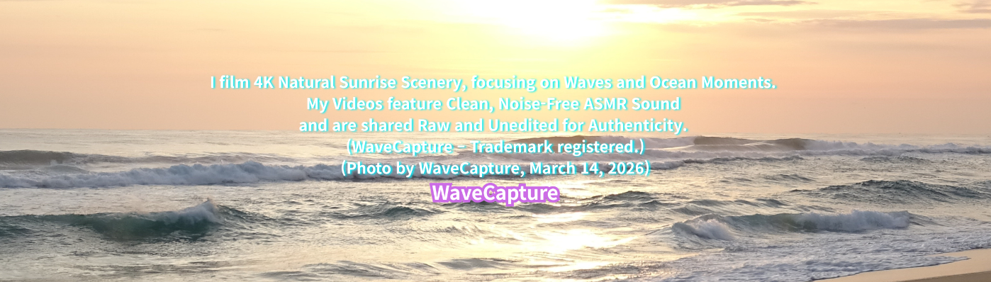 I specialize in capturing high-quality 4K footage of natural sunrise seascapes. Each video features clean, noise-free ASMR sound and is presented in its raw, unedited form to preserve authenticity. WaveCapture – Trademark registered.