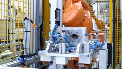 Modern automated factory with latest generation robots and equipment, fourth industrial revolution.
