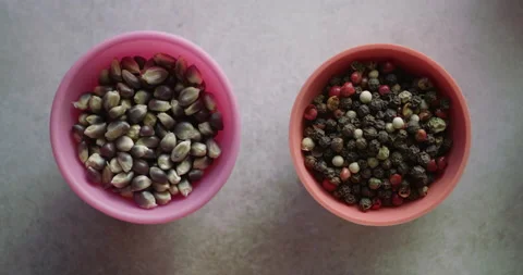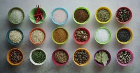 Top down shots of various spices in a kitchen.