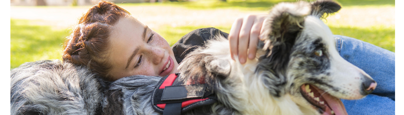 Red-Haired Girl Hugging And Petting Her Dog In The Park.