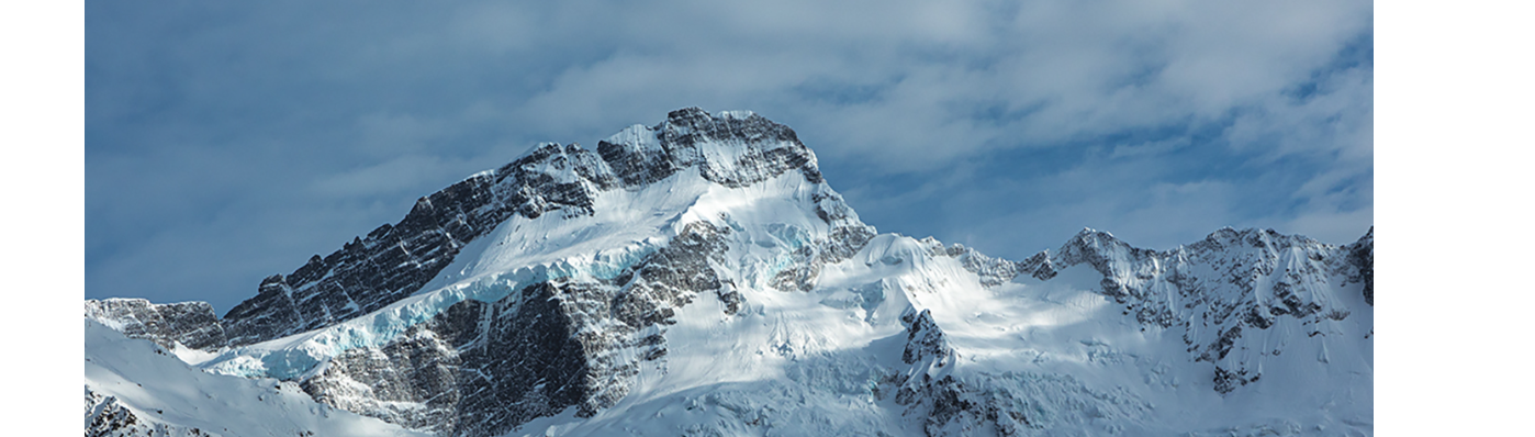 Glacial Valley Below Snowy Mountain Ridgeline, New Zealand, Muller Hut