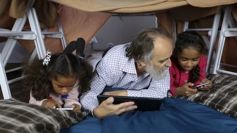 (61)Two adorable little mixed race sisters and caucasian grandfather spending leisure together on Christmas Eve at home, playing chess, games on tablet pc and giving xmas presents.