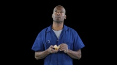 A black shaven head blue collar worker eats a banana - series of humor: [link]/stock-footage/1055489 [item]1055489 icon[/item][/link][link]/stock-footage/1055486 [item]1055486 icon[/item][/link][link]/stock-footage/1055455 [item]1055455 icon[/item][/link]