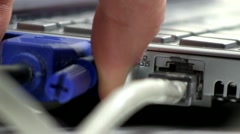 Описание: A macro shot of teenage girl fingers plugging in USB cable and external monitor cable to netbook.