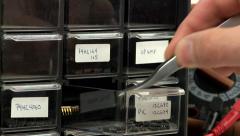 Описание: Hand opens circuit component supply draw bin to get surface mount micro-controllers. Components grabbed with tweezers. Draw is then closed. DVM voltage/current meter is visible in background.