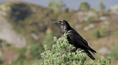 Common Raven perched on top of a small pine tree, calling, looking around, flying off at the end - ambient audio/sound