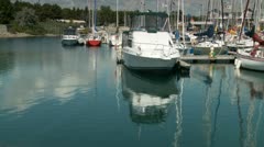 Описание: Sailboat masts and hull of boats reflecting in the almost calm water.