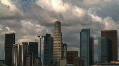 Time-lapse puffy and billowing clouds fly over downtown Los Angeles, California. Within the L.A. cityscape, the famous U.S. Bank building (Library Tower) is the most prominently featured building among the city's other skyscrapers.