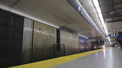 Описание: A TTC subway train pulls into the platform. Commuters get on.