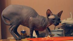 Описание: bald hairless cat, Sphynx, eats meat from the table