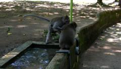 Описание: Monkey fighting to drink. Animals fight for water. The male monkey pushes another male.