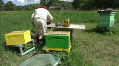 Описание: Russian apiary in the Northwestern part of Pskov . Russian beekeeper checks out beehives.